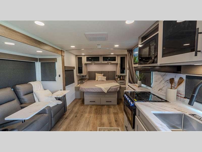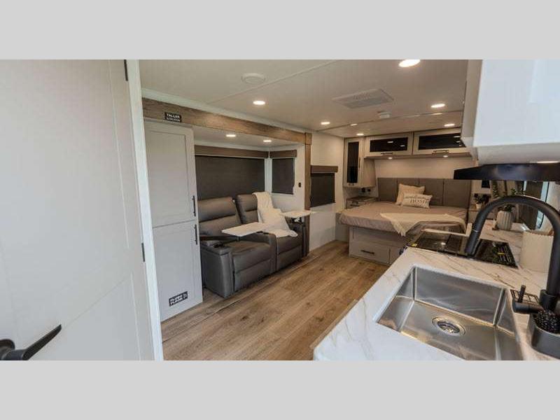 Sleeps 2 Slides 1 Length 23 ft 11 in Ext Height 10 ft 10 in Hitch Weight 568 lbs GVWR 7450 lbs Dry Weight 4992 lbs Fresh Water Capacity 45 gals Grey Water Capacity 45 gals Black Water Capacity 45 gals Available Beds Queen Refrigerator Type 12V Refrigerator Size 10 cu ft Cooktop Burners 3 Shower Size 32" Number of Awnings 1 Water Heater Type On Demand Tankless Awning Info 15' Axle Count 2 Shower Type Radius Solar Wattage 200 watts Similar Floorplans