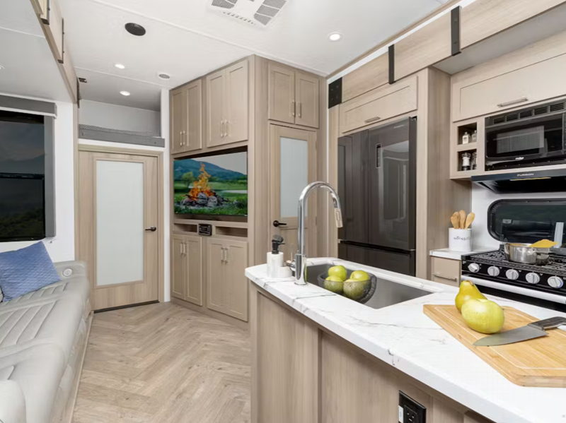 Sleeps 7 Slides 2 Length 35 ft 11 in Ext Height 13 ft 2 in Interior Color Galaxy, Loam Hitch Weight 2795 lbs Dry Weight 12160 lbs Cargo Capacity 4635 lbs Fresh Water Capacity 94 gals Grey Water Capacity 82 gals Black Water Capacity 44 gals Tire Size ST235/80R16F Furnace BTU 35000 btu Fuel Capacity 30 gals Number Of Bunks 1 Available Beds King Refrigerator Type 12V Refrigerator Size 16.5 cu ft Cooktop Burners 3 Shower Size 40" x 28" Number of Awnings 1 Axle Weight 7000 lbs Garage Size 10 ft LP Tank Capacity 30 lbs Water Heater Type Girard On Demand TV Info LR 50" LED TV Awning Info 18' Electric One Touch w/ LED Lights Axle Count 2 Washer/Dryer Available Yes Number of LP Tanks 2 Shower Type Standard Electrical Service 50 amp Similar Floorplans