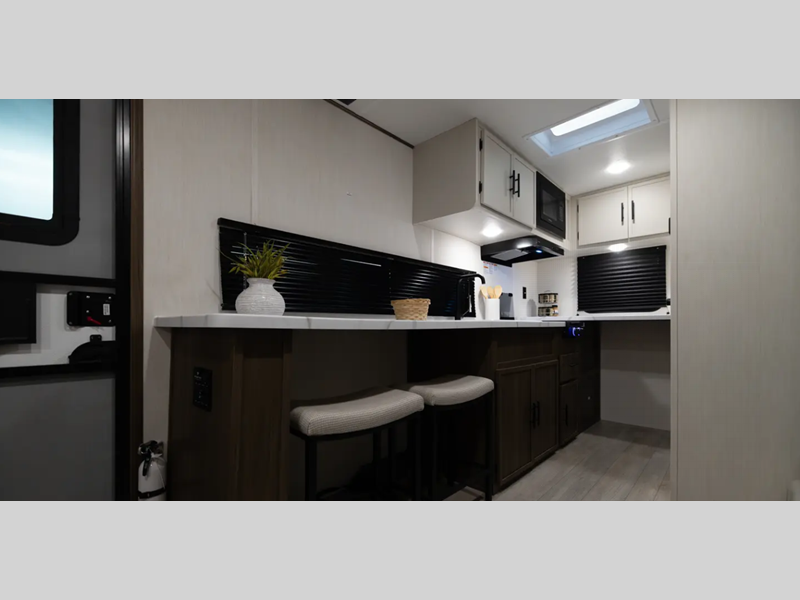 Each is built with an aerodynamic smooth front metal, a fully walkable roof, and automotive grade exterior graphics. All of these construction features will ensure a durable and long-lasting trailer. You will love the seamless pressed countertop inside, along with blackout shades, a large farmhouse one basin sink, and many more comforts!