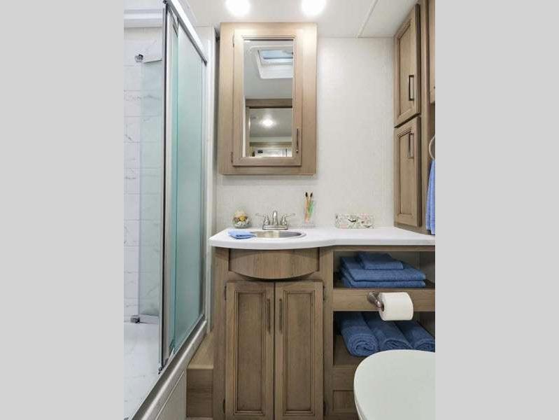 Sleeps 5 Slides 3 Length 38 ft 3 in Ext Width 8 ft 3 in Ext Height 12 ft 4 in Int Height 7 ft Interior Color Hilton Head, Nantucket Blue II Exterior Color Partial Paint; Granite Peak, Silverstone, Full Body Paint; Great Falls, Morning Rain Hitch Weight 8000 lbs GVWR 24000 lbs Fresh Water Capacity 50 gals Tire Size 22.5" Furnace BTU 35000 btu Generator Onan RV QG 5500 Gas Fuel Type Gasoline Engine 7.3L V8 Chassis Ford F-53 Horsepower 335 hp Fuel Capacity 80 gals Wheelbase 252 in Number Of Bunks 1 Available Beds King Torque 468 ft-lb Refrigerator Type Side by Side Cooktop Burners 3 Shower Size 36" x 30" Number of Awnings 1 LP Tank Capacity 88 lbs Water Heater Type Tankless Basement Storage 91 cu. ft. TV Info LR 50" LED Smart TV on Televator, BR 32" LED TV, Ext. 32"on Swivel with Bluetooth Awning Info 20' Patio Power w/Integrated LED Lighting Gross Combined Weight 30000 lbs Shower Type Standard Electrical Service 50 amp Solar Wattage 100 watts Similar Floorplans